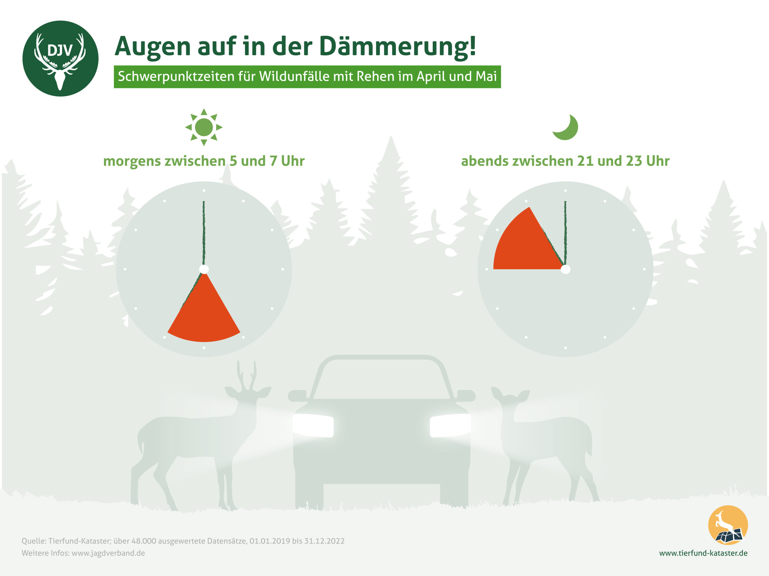Am kommenden Wochenende werden in Deutschland die Uhren wieder auf Sommerzeit umgestellt. Die Gefahr von Wildunfällen nimmt besonders im April und Mai, vor allem zwischen 5.00 Uhr 7.00 Uhr morgens und 21.00 Uhr bis 23.00 Uhr abends, rapide zu. Rehe sind die häufigsten Opfer, sie sind in knapp der Hälfte der Wildunfälle verwickelt. Fleischfresser wie Fuchs, Dachs, Marderhund und Waschbär machen 15 % der Wildunfälle aus. Jeder zehnte Zusammenstoß auf Straßen ereignet sich mit Hasen und Kaninchen. Diese Ergebnisse hat der Deutsche Jagdverband (DJV) aufgrund einer Auswertung aus 48.200 gemeldeten Fällen aus dem Tierfund-Kataster aus den Jahren 2019 bis 2022 veröffentlicht. Über die App „Tierfundkataster“ können Verkehrsteilnehmer und Jäger tot aufgefundene Tiere per App melden. Das Ausmaß von Wildunfällen mit kleineren Säugetieren, die in der offiziellen Wildunfallstatistik nicht erfasst werden, wurde erst durch dieses Projekt sichtbar.