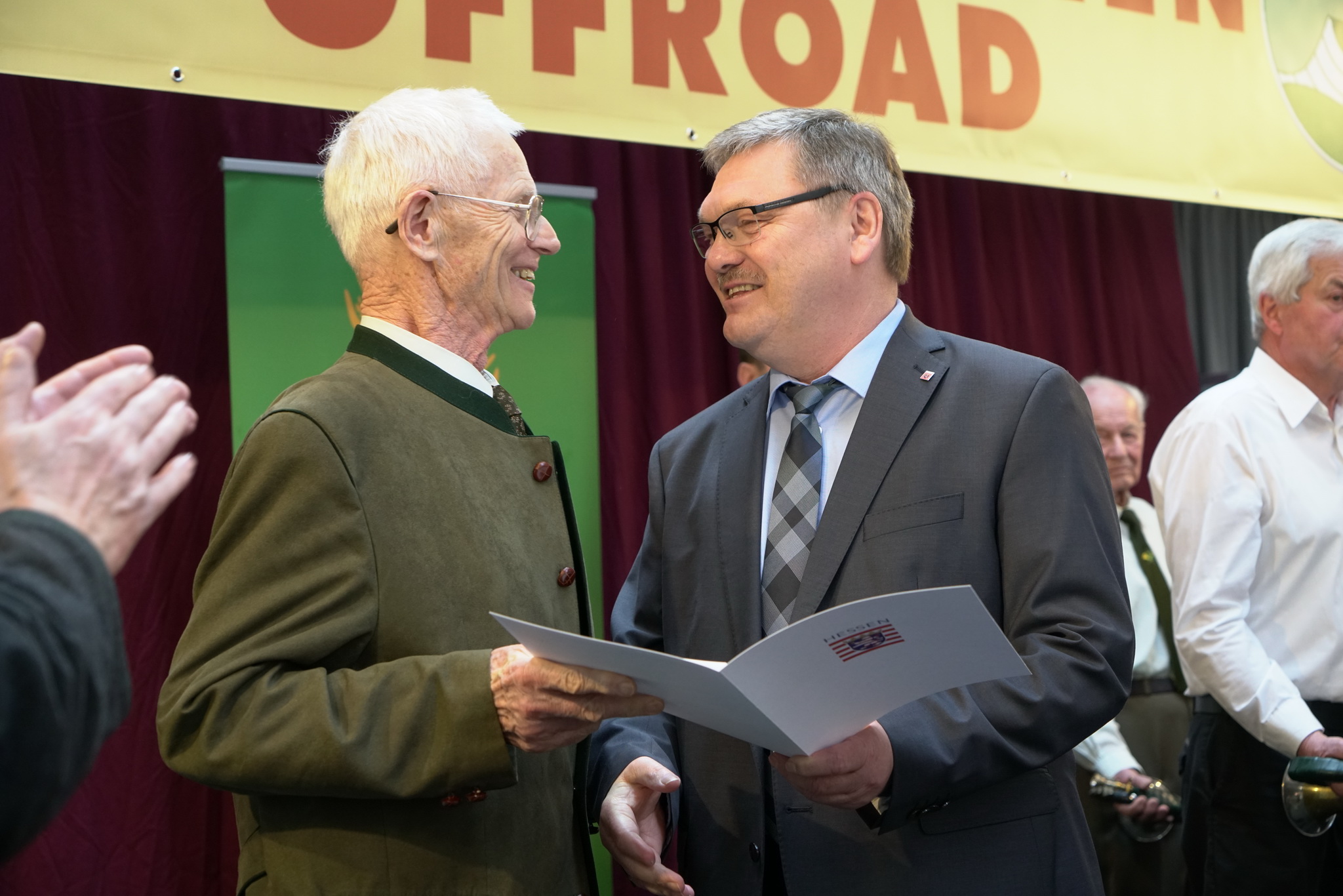 Leinweber forderte die Hundesteuer für brauchbare Jagdhunde, in einem ersten Schritt für die anerkannten Nachsuchenhunde, abzuschaffen, um damit auch das Ehrenamt zu stärken, wie jetzt auch in der neuen Hessischen Verfassung niedergeschrieben ist. Auch Bernhard fragt sich, in welchen Zeiten wir leben, wenn Ratten aus Gullideckeln gerettet werden und es Krankenwagen für Wölfe gibt. Andere Arten wie Esche oder das Niederwild seien deutlich hinter „attraktiven“ Arten wie Kormoran, Wolf und Waschbär gestellt worden. Die Redner waren sich einig, dass der ländliche Raum mindestens den gleichen Stellenwert haben soll wie der urbane Raum und dies auch in der Politik umgesetzt werden muss. Landrat Görig forderte eine schnelle Umsetzung des Koalitionsversprechens zur Bejagung der Jungwaschbären, sieht jedoch hierin nur den ersten Schritt in die richtige Richtung, denn Artenschutz hieße auch Waschbärbejagung.
