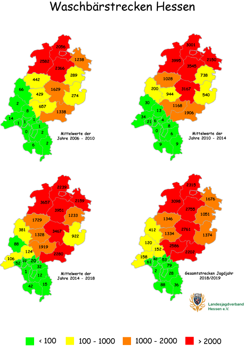 Abbildung 2: Übersicht der Waschbärstrecken in den einzelnen hessischen Landkreisen von 2006 – 2018. Angegeben sind die Mittelwerte aus je vier Jahren. Für das Jagdjahr 2018/2019 ist die Jahrestrecke dargestellt. Grafik: Dominik Deuster (bitte zum Vergrößern anklicken).