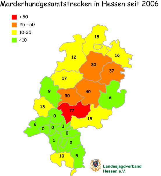 Auch die Jagdstrecken des Marderhundes habe ich graphisch aufbereitet. Da der Marderhund in Hessen noch nicht so weit verbreitet ist, habe ich hier die Gesamtstrecke aus den Jahren 2006 bis 2019 dargestellt. Der Marderhund wurde vor allem in den Mittelhessischen Landkreisen erlegt. Klar an der Spitze liegt hier der Wetteraukreis mit einer Gesamtstrecke von 77 Marderhunden. Im Vergleich zu den Strecken mit jährlich weit über 6 000 Tieren, die in den Nördlichen und Nordöstlichen Bundesländern wie Schleswig-Holstein, Mecklenburg -Vorpommern oder Brandenburg gemeldet werden, sind die Strecken in Hessen noch sehr gering. So wurden in Hessen seit Beginn der Erfassung des Marderhundes auf der Streckenliste im Jagdjahr 1986/1987 insgesamt erst 469 Stück als erlegt oder Fallwild gemeldet.