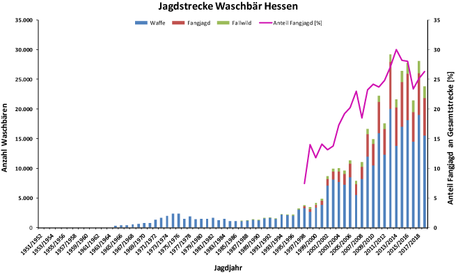 Im Jahre 1934 wurden zur Bereicherung der natürlichen Fauna bei Bringhausen am Edersee zwei Waschbärpärchen ausgesetzt. Der Initiator der Aussetzung Forstmeister Wilhelm Freiherr von Berlepsch ging damals von nur einer geringen Gefahr für die heimische Tierwelt aus und beantragte die Freisetzung von zwei männlichen und zwei trächtigen weiblichen Waschbären beim Landesjägermeister in Berlin. Obwohl Experten davon abrieten, wurde die Freisetzung genehmigt und die vier Tiere, die aus einer Pelztierfarmzucht bei Ippinghausen nahe Kassel stammten, zum Edersee transportiert und in einem Waldstück freigelassen. Auch wenn sie aufgrund ihrer heimlichen und nächtlichen Lebensweise die nächsten Jahre nur selten in Erscheinung traten, entwickelte sich die nordhessische Waschbärpopulation offenbar prächtig, so dass der Waschbär bereits 1954 zum Schutz der heimischen Fauna in das hessische Jagdrecht aufgenommen wurde. Während der nächsten zwei Jahrzehnte wurden in Hessen jährlich nur einige hundert Waschbären erlegt, bis die Jagdstrecke dann ab 1970 die 1000-er Marke knackte. Bis zur Jahrtausendwende blieben die Strecken noch im niedrigen vierstelligen Bereich, so dass im Jahr 2000 erstmals eine hessenweite Strecke von knapp 5000 Tieren gemeldet wurde. Ab diesem Zeitpunkt stieg die jährliche Strecke stetig an und erreichte ihren bisherigen hessischen Höchstwert im Jagdjahr 2012/2013 mit fast 30.000 Waschbären. Vergleichbar hohe Zahlen werden deutschlandweit nur aus Brandenburg und Sachsen-Anhalt gemeldet.