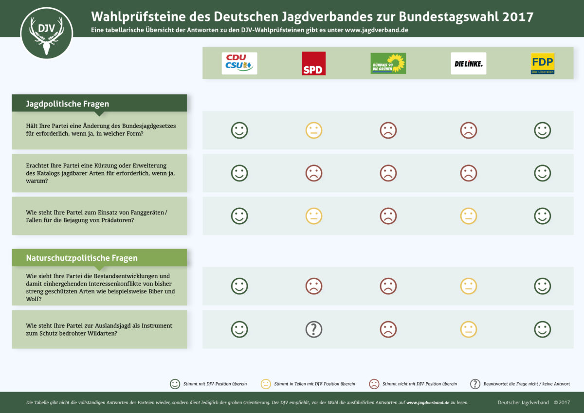 Mit 11 zentralen Forderungen zur Bundestagswahl richtet sich der Deutsche Jagdverband (DJV) an die Parteien. Der Dachverband der Jäger fordert ein klares Bekenntnis zur Jagd, denn über 450.000 staatlich geprüfte Jägerinnen und Jäger erfüllen vielfältige Aufgaben, von denen die Gesellschaft profitiert – darunter Artenschutz, Schutz vor Wildschäden oder vor Tierseuchen.