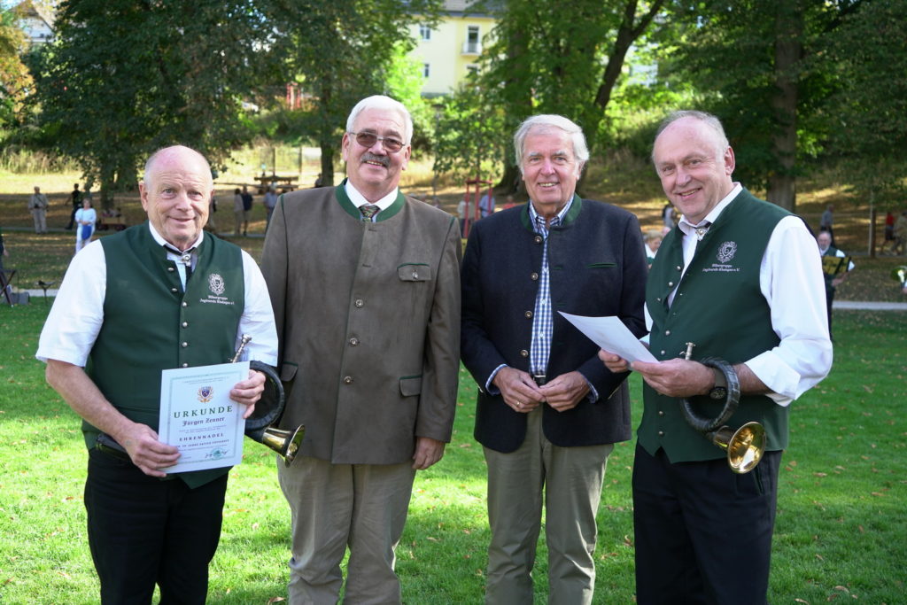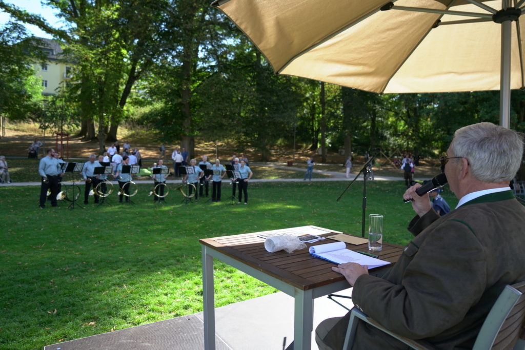 Der Bundes- und Landesbläserobmann Jürgen Keller moderierte das Bläserkonzert im Röthelbachtal bei herrlichem Sonnenschein.