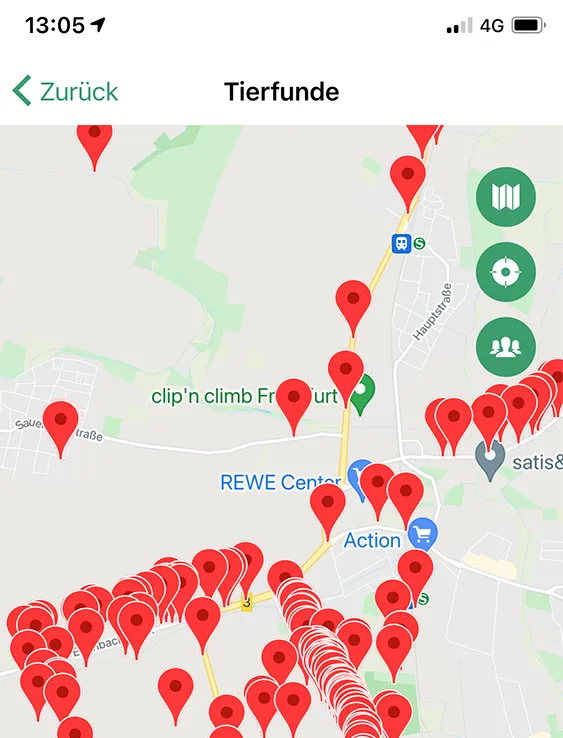 Abbildung 7: Darstellung von Totfundmeldungen in der App. Quelle: Bildschirmfoto der App Tierfund-Kataster.