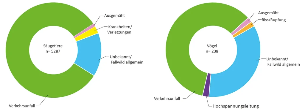 Verkehrsunfälle und andere menschengemachte Ursachen wie das Ausmähen oder Zäunungen wurden bei den Säugern mit über 81% als häufigste Todesursache angegeben. Natürliche Todesursachen wie Krankheiten oder Verletzungen, Nahrungsmangel, Kälte oder Prädation (Riss/Rupfung) machen zusammen nur etwa 4% der Meldungen aus. Bei ca. 14 % der Meldungen war der Grund für das Versterben nicht ersichtlich (Unbekannt / Fallwild allgemein).