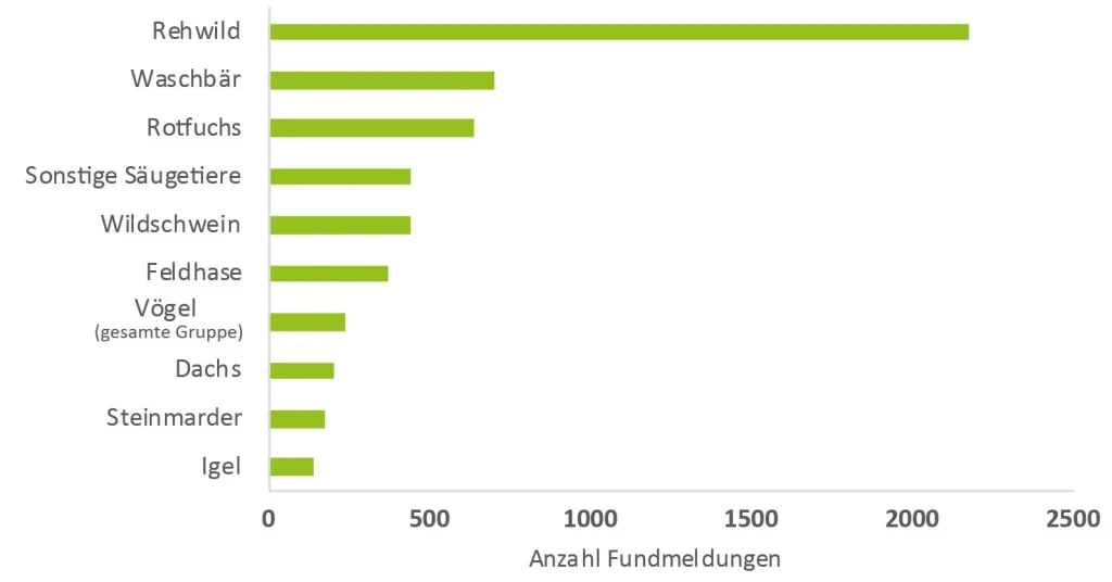 Rehwild stellt mit 2175 Einträgen, die mit großem Abstand am häufigsten gemeldete Wildart dar, gefolgt vom Waschbär (704), Fuchs (639), Schwarzwild (440), Feldhase (368), Dachs (220), Steinmarder (175) und dem Igel (137). Bei den Vögeln wurden besonders häufig Funde von Mäusebussard (52), Taube (44), Fasan (20) und Stockente (13) gemeldet.