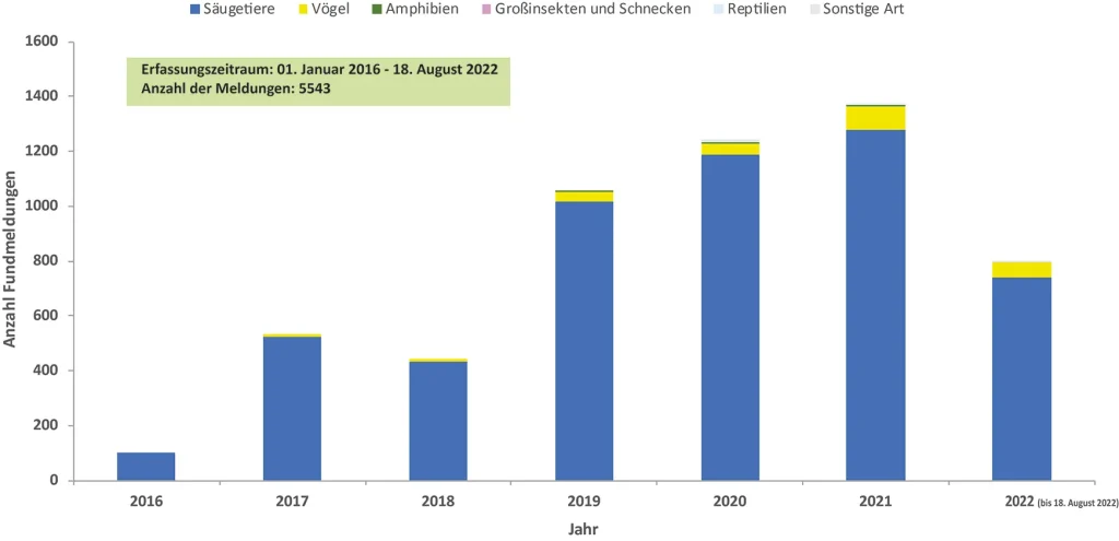 Nach Durchsicht und Abzug von nicht auswertbaren Datensätzen konnten 5543 Meldungen aus dem Zeitraum vom 1. Januar 2016 – 18. August 2022 in die Auswertung einbezogen werden. Über 95% der Meldungen betrafen Totfunde von Säugetieren (5287). Der Fund eines toten Vogels wurde in 243 Fällen gemeldet (ca. 4,4 %), während Wildtiere wie Reptilien (z.B. Eidechsen), Amphibien (z.B. Frösche) oder Großinsekten (z.B. Libellen) mit nur insgesamt 18 Fundmeldungen den geringsten Anteil (ca. 0,32%) ausmachen.