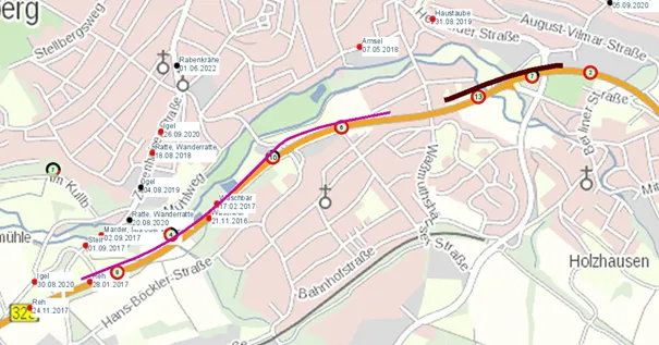 Abbildung 6: Darstellung der Wildunfallschwerpunkte am Beispiel der B323 bei Homberg/Efze. Die in den Kreisen angegebene Zahl gibt die Anzahl weiterer, örtlich nah beieinander liegender Funde an. Quelle: Bildschirmfoto der Karte des Tierfund-Katasters, Cadenza..