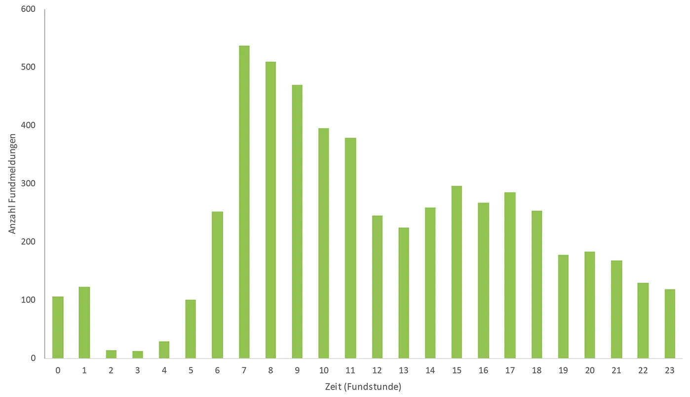 Im Tagesverlauf werden die meisten Funde zwischen 7 Uhr und 11 Uhr gemeldet. Ein weiterer Peak ist in den Mittagsstunden zwischen 15 Uhr und 17 Uhr zu verzeichnen. In beiden Fällen wird der Berufsverkehr eine wesentliche Rolle spielen, da zum einen auf der Fahrt zur oder von der Arbeit die am Straßenrand liegenden Verkehrsopfer gesehen und gemeldet werden und zum anderen, weil in dieser Zeit auch die Wildunfallhäufigkeit aufgrund des verstärkten Verkehrsaufkommens deutlich höher ist. In der Winterzeit kommt noch hinzu, dass sich der Berufsverkehr mit der Dämmerungsphase, in der die Aktivität der Wildtiere nochmals deutlich zunimmt, überschneidet und sich dadurch auch die Wahrscheinlichkeit einer Kollision weiter erhöht.