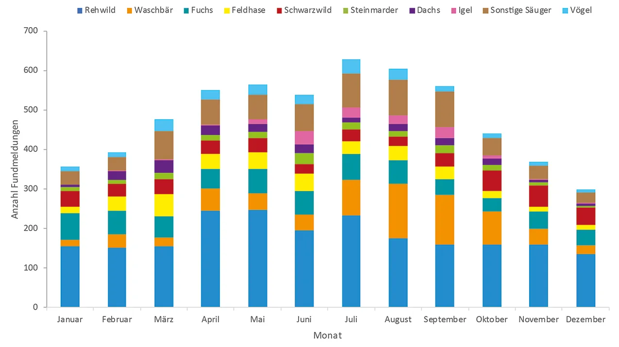 Die monatliche Verteilung der Meldungen zeigt, dass die meisten Meldungen in den Monaten April bis September erfolgen. Beim Rehwild ist besonders der Monat April und Mai sowie der Juli betroffen und damit die Monate, in denen das Rehwild besonders aktiv ist. Totfundmeldungen von Waschbären erfolgen vor allem zwischen Juli und Oktober, also in der Zeit, in der die Jungtiere bereits mobil sind und ihre ersten Streifzüge unternehmen. Auch beim Igel spiegeln die Fundmeldungen die Lebensweise wider. Die meisten Meldungen zu Totfunden von Igeln wurden in den warmen Monaten registriert, während ab dem späten Herbst bis zum Frühjahr, wenn Igel Winterruhe halten, so gut wie keine Meldungen erfolgten. Schwarzwild wird dagegen besonders häufig in den kalten Monaten tot aufgefunden. Auch hier ist der Großteil an Fundmeldungen auf Verkehrsunfälle zurückzuführen und gibt das natürliche Bewegungsverhalten wieder. Auf der Suche nach Nahrung haben Wildschweine in den Wintermonaten einen deutlich größeren Aktionsradius als in den Sommermonaten, wenn vor allem durch die Landwirtschaft ausreichend Nahrung vorhanden ist. Durch die erhöhte Mobilität steigt dann auch das Risiko für eine Kollision mit einem Fahrzeug.
