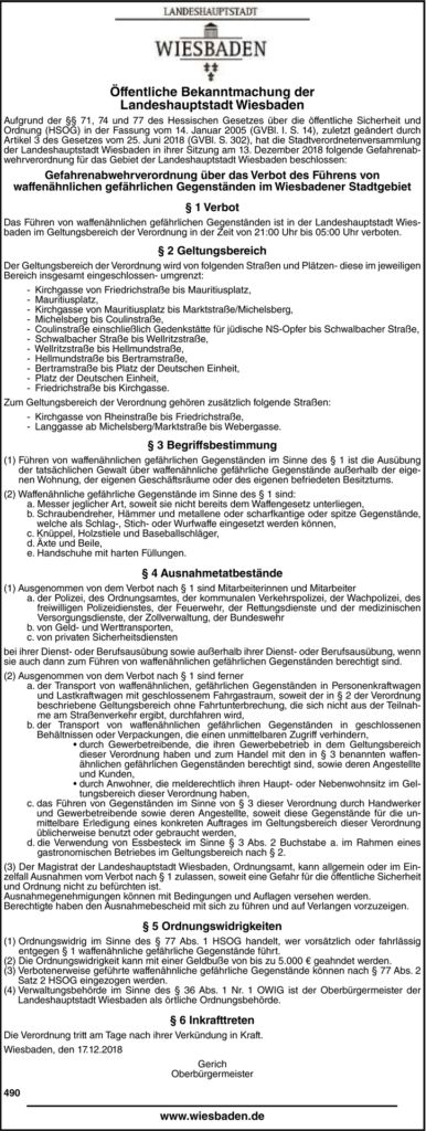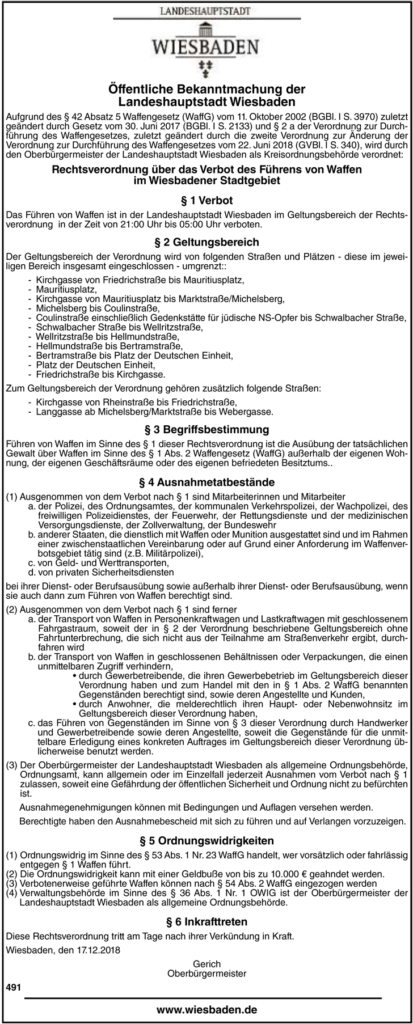„Falls Sie in Wiesbaden wohnen oder zu Besuch sind, achten Sie darauf, keine Waffen oder waffenähnliche Gegenstände in der Zeit zwischen 21:00 Uhr und 5.00 Uhr in der ausgewiesenen Waffenverbotszone mit sich zu führen. Das Verbot gilt auch für das kleinste Taschenmesser oder ein Multifunktionstool. Auch wenn ein Jägerstammtisch oder eine sonstige Veranstaltung stattfindet, dürfen keine Messer oder sonstige waffenähnliche Gegenstände in die Waffenverbotszone mitgeführt werden.