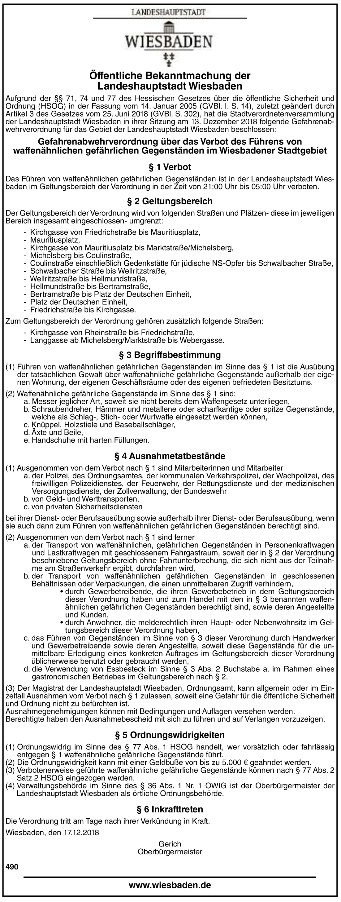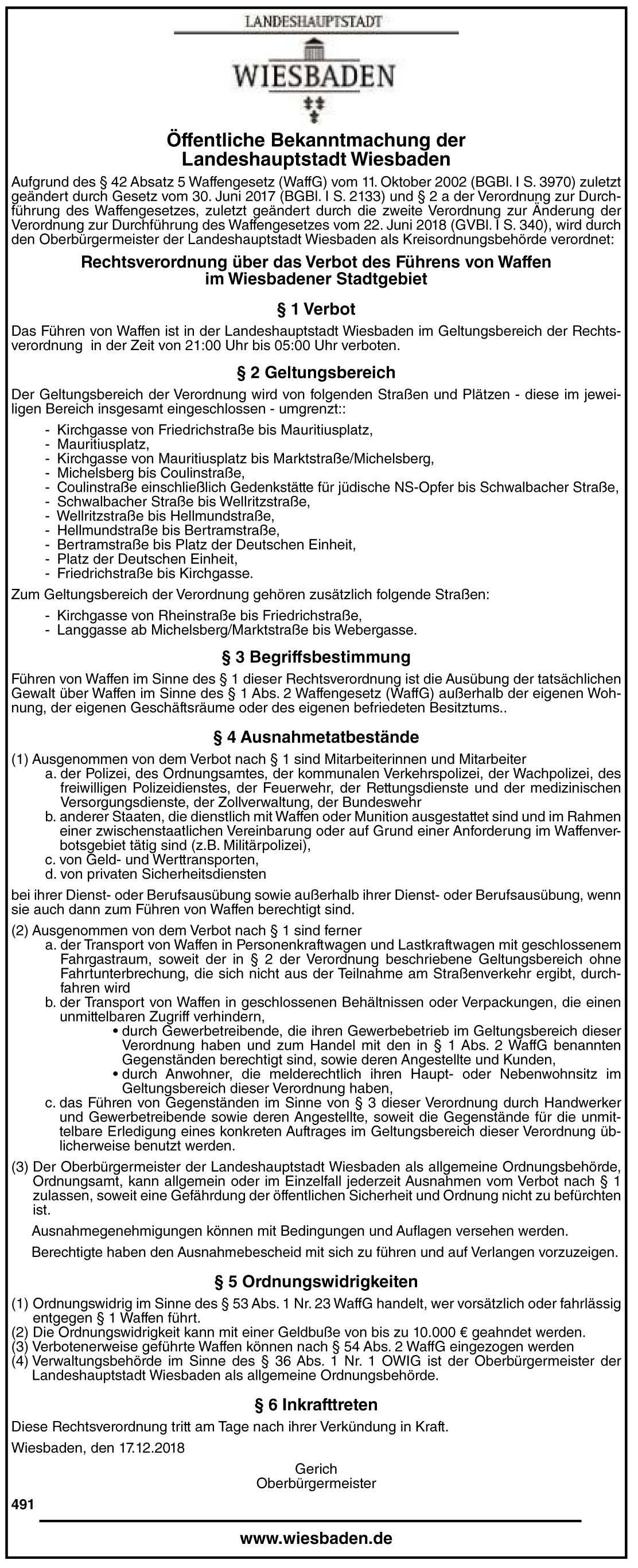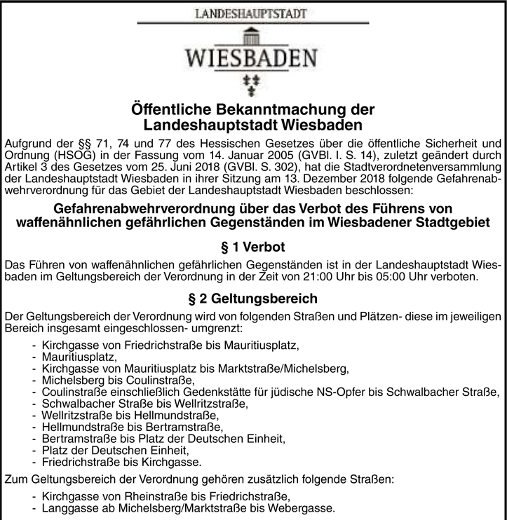 Auch die Landeshauptstadt Wiesbaden hat zum 1. Januar 2019 eine Waffenverbotszone in Teilen der Innenstadt und des Westends eingerichtet. Am 13. Dezember 2018 hat die Stadtverordnetenversammlung eine „Rechtsverordnung über das Verbot des Führens von Waffen im Wiesbadener Stadtgebiet“ sowie eine „Gefahrenabwehrverordnung über das Verbot des Führens von waffenähnlichen gefährlichen Gegenständen im Wiesbadener Stadtgebiet“ beschlossen.
