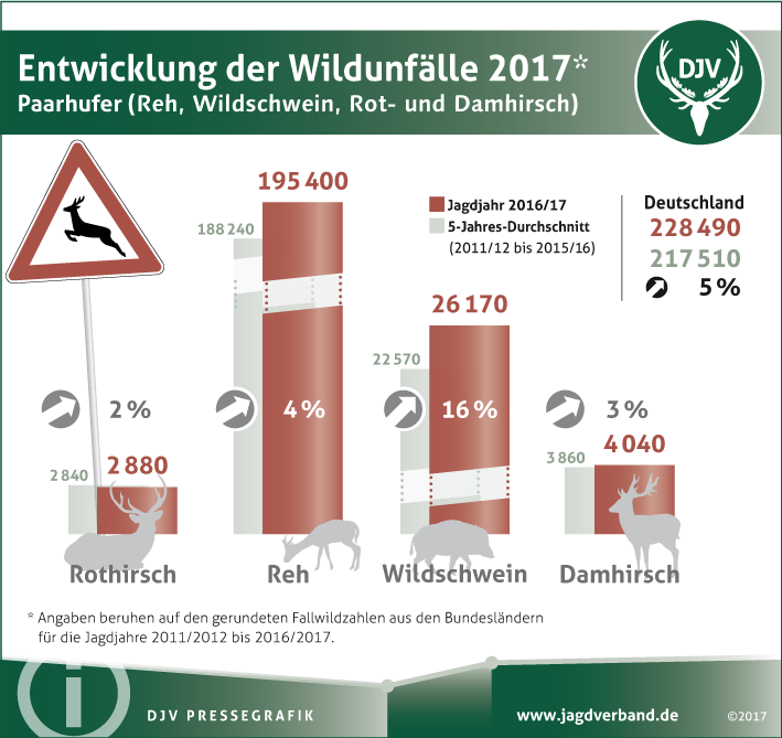 (Berlin/München, 7. Dezember 2017) Laut aktueller Statistik des Deutschen Jagdverbands (DJV) gab es im vergangenen Jagdjahr – die Zeit vom 1. April 2016 bis 31. März 2017 – knapp 228.500 Wildunfälle. Während das im Vergleich zum Vorjahr eine Stagnation bedeutet, ist es gemessen am Schnitt der vorangegangenen fünf Jahre eine Steigerung um fünf Prozent. Hauptverursacher ist das Reh (86 Prozent), gefolgt vom Wildschwein (12 Prozent).