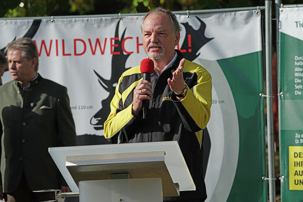 Am Nachmittag berichtete Regierungspräsident Dr. Christoph Ullrich dem Publikum von seinen eigenen Erfahrungen: „Heute Morgen auf dem Weg hier her habe ich am Straßenrand an verschiedenen Stellen zwei Waschbären gesehen und ich hatte auch das zweifelhafte Vergnügen vor zweieinhalb Jahren mit meinem Dienstwagen ein Reh „mitnehmen“ zu dürfen. Am hellen Tag kam es aus dem Graben heraus. Bis ich richtig realisiert hatte, dass da etwas ist, hatte ich das Tier schon mit meiner Autoecke erwischt.“ Er lobte das Engagement der beteiligten Projektpartner und bekräftige, wie wichtig es sei, das Thema „Wildunfälle“ in das Bewusstsein der Bevölkerung zu bringen und damit möglichst dafür zu sorgen, dass weniger Unfälle passieren.