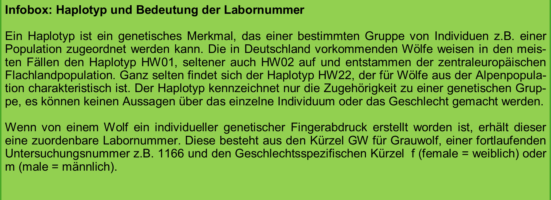 Durch die Analyse genetischer Spuren von Rissen, Losungen oder Gewebeproben tot aufgefundener Tiere konnten zwischen Februar 2019 und April 2020 zehn individuelle Wölfe bestätigt werden.